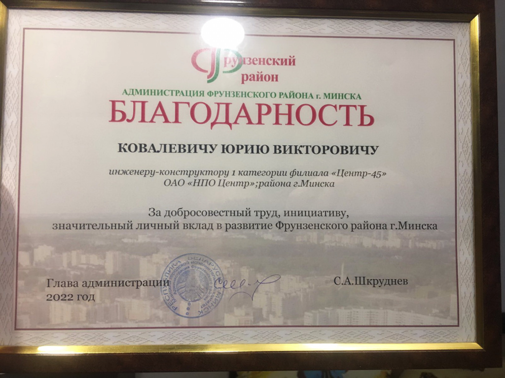 В канун 71-ой годовщины со дня образования Фрунзенского района г. Минска в актовом зале администрации прошла концертная программа и награждение лучших работников предприятий и организаций, внесших значительный вклад в развитие Фрунзенского района г. Минска.Благодарность администрации Фрунзенского района была объявлена и инженеру-конструктору I категории филиала "Центр-45" ОАО "НПО Центр" Костевичу Юрию Викторовичу.