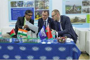 ОАО «НПО Центр» НАН Беларуси представило на выставке передовые, не имеющие аналогов в Индии, технологии получения сухим способом искусственных обеспыленных песков и компонентов сухих строительных смесей, переработки техногенных отходов. Главным фактором привлечения посетителей на стенд стала демонстрация мобильного дробильно-сортировочного комплекса для переработки высоко-абразивных материалов на базе центробежно-ударной дробилки на газостатической опоре ДЦ 1.0 с зоной сепарации.